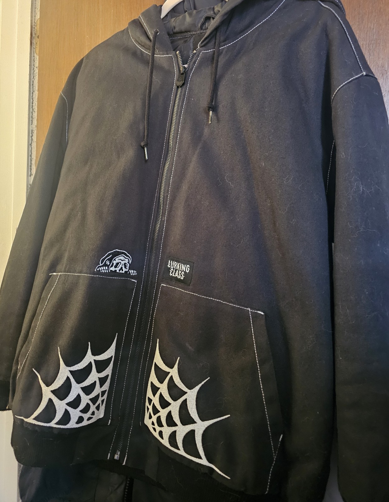 This Lurking Class jacket is practically new, having only been worn a few times. It's a black, hooded jacket featuring distinctive white stitching and large white spiderweb graphics on the front pockets. The back of the jacket also has "LURKING CLASS" in a spiked white font, and a smaller spiderweb design on the back of the hood. Inside, the jacket has an interior pocket with a "PROPERTY OF LURKING CLASS - OFFICIAL MEMBER" label, and another tag indicating it's a size L and "MADE IN CHINA." The main inner tag proudly displays the Lurking Class motto: "DISTURBING THE COMFORTABLE COMFORTING THE DISTURBED."