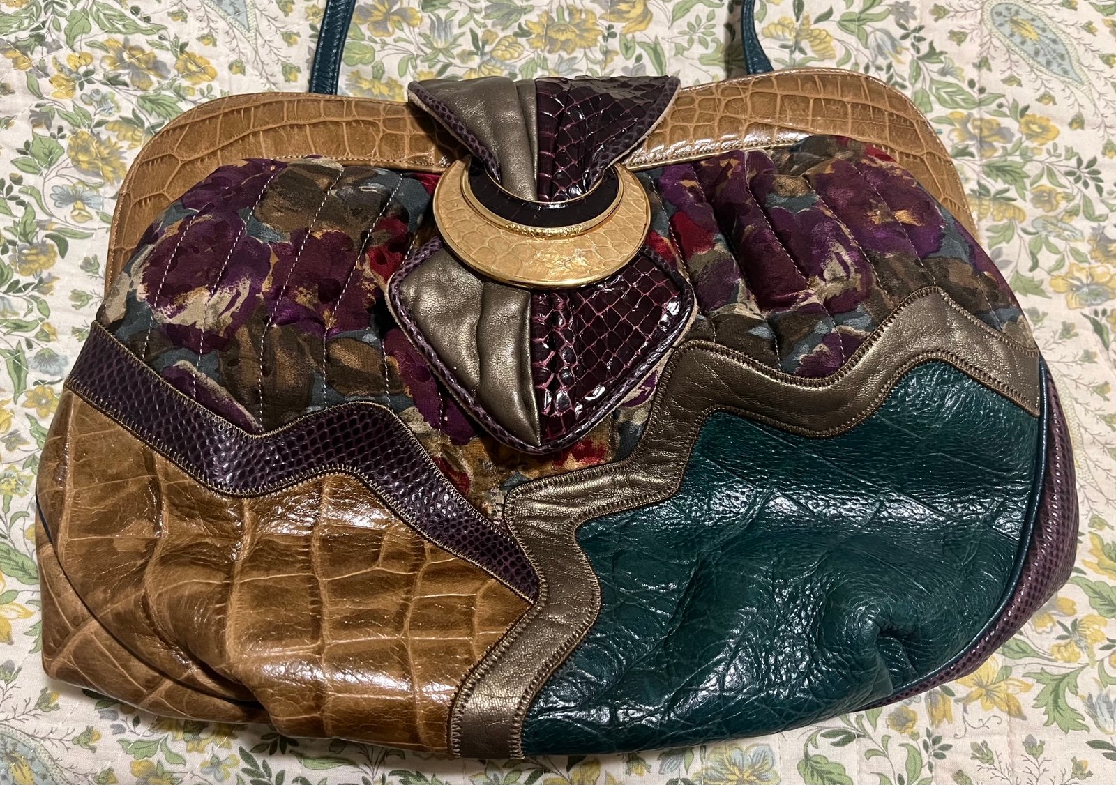 The VTG Sharif Multi-color Patchwork/Exotic Reptile Leather Shoulder Bag is a vintage accessory crafted in the USA in the 1980s. This original piece features a boho look, perfect for everyday wear by women. The bag is made of very soft leather with a unique multi-color quilted patchwork design, making it a standout statement piece for any outfit. It measures 12” wide x 9” tall (excluding strap) x 4” deep. Strap drop is 23” but can be knotted to shorten the length. It has a very unique clamshell hinged open/close method. There’s one inside hidden zipper pocket. There are no stains or rips noted. There outside flap closure is magnetic and has a beautiful gold metal reptile pattern. Nice addition to any retro purse collection. Must see to appreciate.